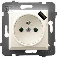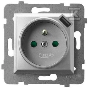 Gniazdo pojedyncze z uziemieniem z przesłonami torów prądowych, z ładowarką USB, srebro ARIA o numerze katalogowym GP-1UZPUSB/M/18 w kategorii Gniazda podtynkowe, Gniazda instalacyjne. Produkt wyprodukowany przez markę OSPEL, seria ARIA.