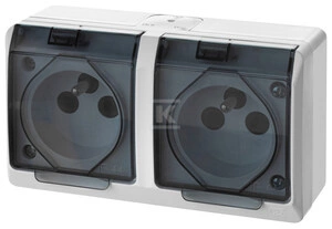 Gniazdo 2-krotne, natynkowe, IP44, białe, klapka dymna, HERMES o numerze katalogowym 0322-01 w kategorii Gniazda natynkowe, Gniazda instalacyjne. Produkt wyprodukowany przez markę ELEKTRO-PLAST NASIELSK, seria HERMES.