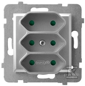 Gniazdo potrójne EURO z przesłonami torów prądowych, srebro ARIA o numerze katalogowym GP-3UP/M/18 w kategorii Gniazda podtynkowe, Gniazda instalacyjne. Produkt wyprodukowany przez markę OSPEL, seria ARIA.