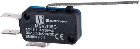 Łącznik miniaturowy dźwignia plaska b.długa o numerze katalogowym MSV\105C w kategorii Krańcówki, Czujniki mechaniczne. Produkt wyprodukowany przez markę SPAMEL, seria MSV.