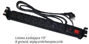 Listwa zasilająca 19" 3m 8 gniazd/wyłącznik/bezpiecznik - czarna o numerze katalogowym 19-0044C w kategorii Gniazda i akcesoria IT, Infrastruktura IT. Produkt wyprodukowany przez markę SABAJ, seria AKCESORIA 19".