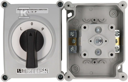 Łącznik krzywkowy 16A, przełącznik zmiany kierunku obrotów L-0-P, w obudowie OB2,  o numerze katalogowym  ŁK16R-3.8368\OB2  w kategorii Wyłączniki i rozłączniki obrotowe, Wyłączniki, rozłączniki. Produkt wyprodukowany przez markę SPAMEL.