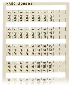 Mata oznacznikowa WSB, jako karta, z nadrukiem, A140.0, A140.1,.., A149.6, A149.7(po1x), nierozciągalne, nadruk pionowo, do montażu zatrzaskowego, biały o numerze katalogowym 209-981 w kategorii Niesklasyfikowane>Pozostałe. Produkt wyprodukowany przez markę WAGO, seria 209.