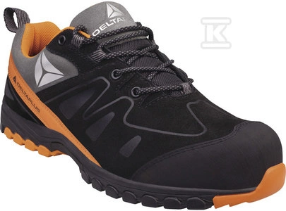 Półbuty z weluru skórzanego cielęcego, podeszwa z phylonu, kauczuku i nitrylu, podnosek i wkładka kompozytowe czarno-pomarańczowy 43 o numerze katalogowym  BROOKS3NO43 w kategorii Obuwie robocze, Ochrona nóg. Produkt wyprodukowany przez markę DELTA PLUS.
