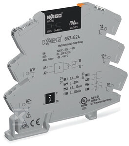 Półprzewodnikowy przekaźnik czasowy, znamionowe napięcie wejściowe 24 V DC, zakres napięcia wyjściowego 0 … 24 V DC, maksymalny prąd długotrwały 2 A, podłączanie 2-przewodowe, wielofunkcyjny/wiele zakresów czasowych, sygnalizacja statusu żółta, szerokość 6 mm o numerze katalogowym 857-624 w kategorii Niesklasyfikowane>Pozostałe. Produkt wyprodukowany przez markę WAGO, seria 857.