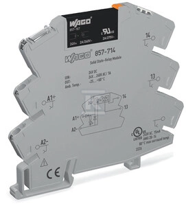 Przekaźnik półprzewodnikowy, znamionowe napięcie wejściowe 24 V DC, zakres napięcia wyjściowego 24 … 240 V AC, maksymalny prąd długotrwały 2 A, podłączanie 2-przewodowe, załączanie w przejściu przez zero, sygnalizacja statusu żółta, szerokość 6 mm, szary o numerze katalogowym 857-714 w kategorii Niesklasyfikowane>Pozostałe. Produkt wyprodukowany przez markę WAGO, seria 857.