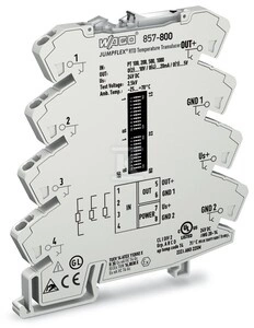 Przetwornik pomiarowy temperatury do czujników RTD, prądowy i napięciowy sygnał wyjściowy, konfiguracja przy pomocy mikroprzełączników DIP, napięcie zasilania 24 V DC, szerokość 6 mm, jasnoszary o numerze katalogowym 857-800 w kategorii Niesklasyfikowane>Pozostałe. Produkt wyprodukowany przez markę WAGO, seria 857.