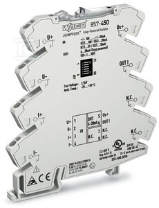 Przetwornik zasilany z pętli wyjściowej, bipolarny prądowy i napięciowy sygnał wejściowy, prądowy sygnał wyjściowy, konfiguracja przy pomocy mikroprzełączników DIP, zasilanie na wyjściu, szerokość 6 mm, 2,50 mm2 o numerze katalogowym 857-450 w kategorii Niesklasyfikowane>Pozostałe. Produkt wyprodukowany przez markę WAGO, seria 857.
