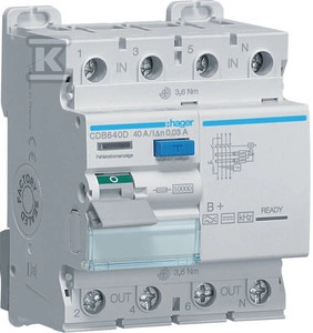 Wyłącznik różnicowoprądowy 3P+N 40A 30mA 10kA B+ o numerze katalogowym CDB640D w kategorii Pozostałe, Niesklasyfikowane. Produkt wyprodukowany przez markę HAGER, seria RCCB.