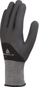 Rękawice dziane z poliestru spandex, powlekane w 3/4 nitrylem i kropkami nitrylowymi, ścieg 15 czarny 11 o numerze katalogowym  VE725NO11 w kategorii Rękawice poliestrowe i poliamidowe, Ochrona rąk. Produkt wyprodukowany przez markę DELTA PLUS.