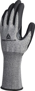 Rękawice dziane z włókna deltanocut, dłoń powlekana pianką nitrylową, wzmocnienie kciuka/palca wskazującego, ścieg 13 szaro-czarny 9 o numerze katalogowym  VECUTD03GR09 w kategorii Rękawice poliestrowe i poliamidowe, Ochrona rąk. Produkt wyprodukowany przez markę DELTA PLUS.