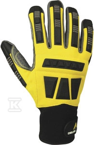 Rękawice z poliestru i poliuretanu, dłoń z poliamidu i poliuretanu z kropkami z pvc, wzmocnienia z tpr żółto-szaro-czarny 12 o numerze katalogowym  VV900JA12 w kategorii Rękawice poliestrowe i poliamidowe, Ochrona rąk. Produkt wyprodukowany przez markę DELTA PLUS.