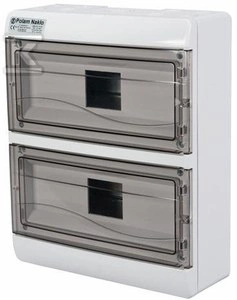 Rozdzielnica natynkowa 8x16+20x10mm2, 26 modułów (2x13), zaciski PE+N z drzwiczkami IP55 o numerze katalogowym 6664-226 w kategorii Tworzywowe natynkowe, Rozdzielnice i obudowy. Produkt wyprodukowany przez markę POLAM-NAKŁO.