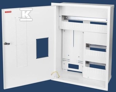 Rozdzielnica wnękowa RW-38, z zamkiem i okienkiem, miejsce na 1 licznik 3F oraz 38 zabezpieczeń typu s. o numerze katalogowym  RW-38 Z/O w kategorii Metalowe podtynkowe, Rozdzielnice i obudowy. Produkt wyprodukowany przez markę KARWASZ, seria RW.