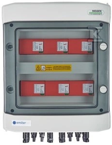 Rozdzielnica przyłączeniowa DC hermetyczna IP65 EMITER z ogranicznikiem przepięć DC Dehn 1000V typu 1+2, 6x łańcuch PV, 6x MPPT o numerze katalogowym EM-654_DC w kategorii Zabezpieczenie instalacji>Obudowy. Produkt wyprodukowany przez markę EMITER.