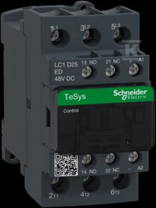 Stycznik mocy TeSys D AC3 25A 3P 1NO 1NC cewka 48VDC zaciski skrzynkowe o numerze katalogowym LC1D25ED w kategorii Styczniki typ AC, Styczniki. Produkt wyprodukowany przez markę SCHNEIDER ELECTRIC.