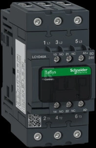 Stycznik mocy TeSys D 40A 3P 1NO 1NC cewka 24VDC zaciski EVK skrzynkowe o numerze katalogowym LC1D40ABD w kategorii Styczniki typ AC, Styczniki. Produkt wyprodukowany przez markę SCHNEIDER ELECTRIC.