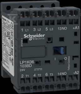 Stycznik mocy TeSys K, 12A, 3P, 1NO, cewka 24VDC, zaciski sprężynowe o numerze katalogowym LP1K12103BD w kategorii Styczniki>Styczniki typ DC. Produkt wyprodukowany przez markę SCHNEIDER ELECTRIC, seria TESYS K.