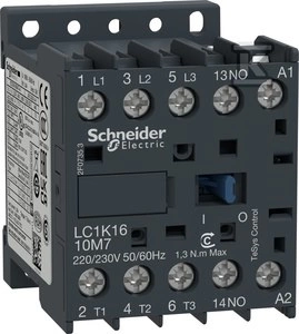 Stycznik mocy TeSys K, AC3, 16A, 3P, 1NO, cewka 220/230VAC, zaciski skrzynkowe o numerze katalogowym LC1K1610M7 w kategorii Styczniki>Styczniki typ AC. Produkt wyprodukowany przez markę SCHNEIDER ELECTRIC, seria TESYS K.
