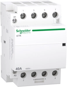 Stycznik modułowy, Acti9 iCTK50-40-40-230 40A 4NO 50Hz 220/240 VAC, bez możliwości rozbudowy o styki pomocnicze o numerze katalogowym A9C40440 w kategorii Styczniki instalacyjne, Styczniki. Produkt wyprodukowany przez markę SCHNEIDER ELECTRIC.