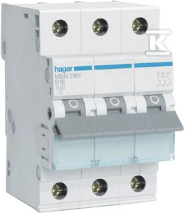 Wyłącznik nadmiarowo-prądowy, 6kA, charakterystyka B, 3-biegunowy, 16A o numerze katalogowym  MBN316E w kategorii Wyłączniki nadprądowe 6kA, Wyłączniki nadprądowe. Produkt wyprodukowany przez markę HAGER.