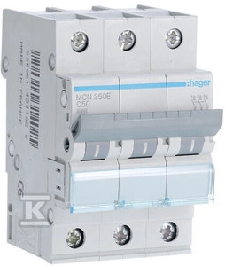Wyłącznik nadmiarowo-prądowy, 6kA, charakterystyka C, 3-biegunowy, 50A o numerze katalogowym  MCN350E w kategorii Wyłączniki nadprądowe 6kA, Wyłączniki nadprądowe. Produkt wyprodukowany przez markę HAGER.