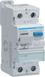 Wyłącznik różnicowoprądowy 1P+N 25A 30mA 10kA AC o numerze katalogowym CDC525J w kategorii Wyłączniki różnicowoprądowe typ AC, Wyłączniki różnicowoprądowe. Produkt wyprodukowany przez markę HAGER.