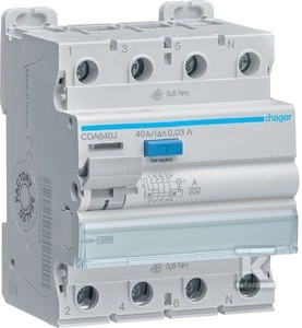 Wyłącznik różnicowoprądowy 3P+N 40A 30mA 10kA A o numerze katalogowym CDA640J w kategorii Wyłączniki różnicowoprądowe typ A, Wyłączniki różnicowoprądowe. Produkt wyprodukowany przez markę HAGER.
