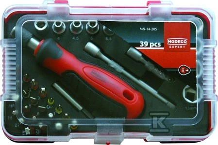 Zestaw wkrętak przedłużki nasadki bity PVC box 39cz o numerze katalogowym MN-14-205 w kategorii Wkrętaki i szczypce>Wkrętaki - zestawy. Produkt wyprodukowany przez markę MODECO EXPERT.