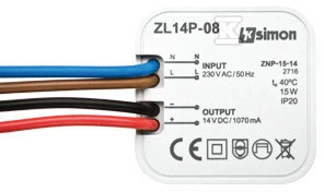 Zasilacz LED dopuszkowy 14V, DC, 8W, SIMON54 o numerze katalogowym ZL14P-08 w kategorii Pozostały osprzęt mieszkaniowy, biurowy, Osprzęt mieszkaniowy, biurowy i RTV. Produkt wyprodukowany przez markę KONTAKT-SIMON, seria SIMON 54.