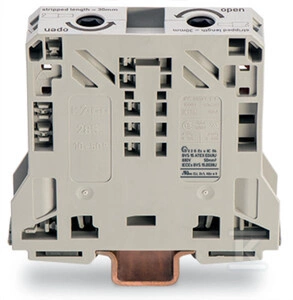 Złączka przelotowa 2-przewodowa, 50 mm2, do zastosowań Ex e II, boczne miejsca na oznaczniki, tylko na szynę TS 35 x 15, POWER CAGE CLAMP, 50,00 mm2, jasnoszary o numerze katalogowym 285-950 w kategorii Niesklasyfikowane>Pozostałe. Produkt wyprodukowany przez markę WAGO, seria 285.